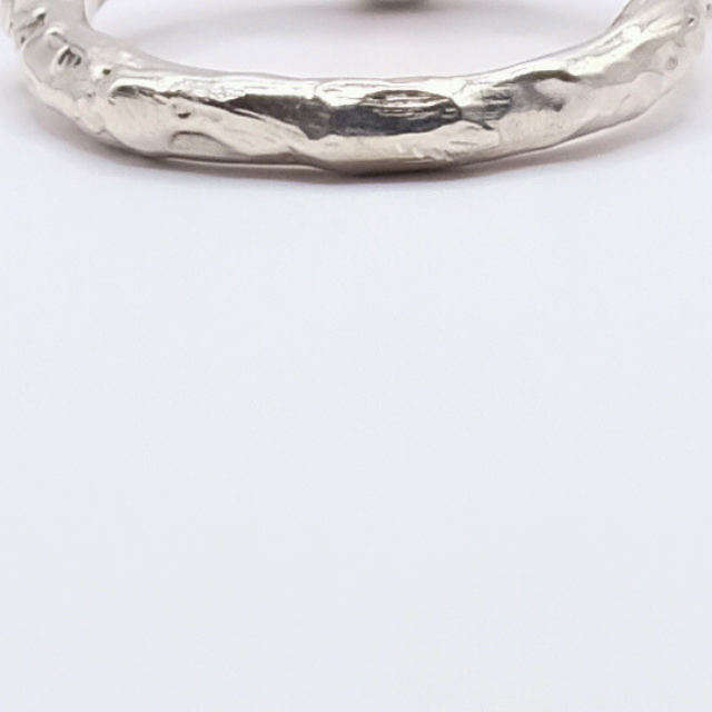 Alba trägt die Wärme und Ruhe des ersten Lichts in sich. Das fliessende Silber umarmt den Padparadscha Saphir. Es ist ein Tanz der zwei Materialien, in welchem niemand den Lead hat, sondern ganz nach dem Motto des Lagom beide abwechselnd einander folgen und sich miteinander bewegen.