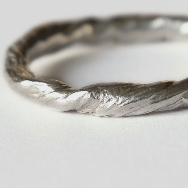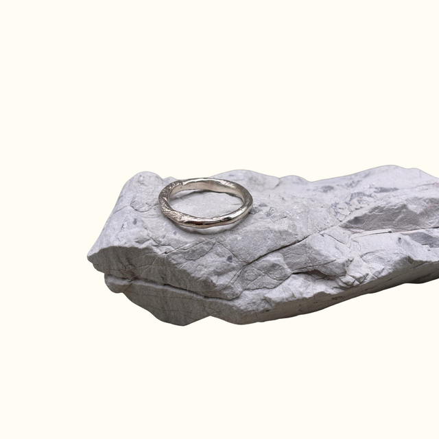 Dieser feine Silberring wurde mit Bio-Bienenwachs aus Malters geformt. Die organische Struktur des Wachses blieb erhalten und verleiht dem Ring seine besondere Textur. Das Finish ist natürlich und zeigt einen zarten Glanz.